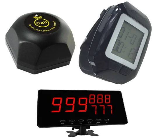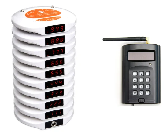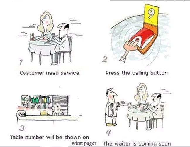 Беспроводная система вызова ресторана состоит из передатчика кнопки вызова и приемника часов/экрана. Один пейджер для наручных часов может работать с 500 кнопками вызова. Один приемник монитора может работать с 999 кнопками вызова. Система подкачки официанта широко используется в индустрии развлечений и питания, таких как отели, рестораны, Корт, чайные и кофейные дома и бары, KTV, магазин тортов для гостей вызова официантов, чтобы служить.