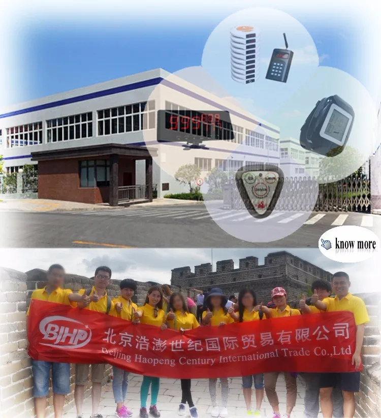 Haopeng Century является профессиональным поставщиком и занимается экспортным бизнесом в течение многих лет. Мы специализируемся на поставке различных элементов беспроводной системы вызова с настольными Бутто наручные часы, ТВ-дисплей и т. Д. И наш основной продукт цифровой клавиатуры передатчики с coaster пейджеры. Мы сотрудничаем с клиентами по всему Слову и имеем богатый опыт. Наша компания расположена в центре делового центра Пекина,