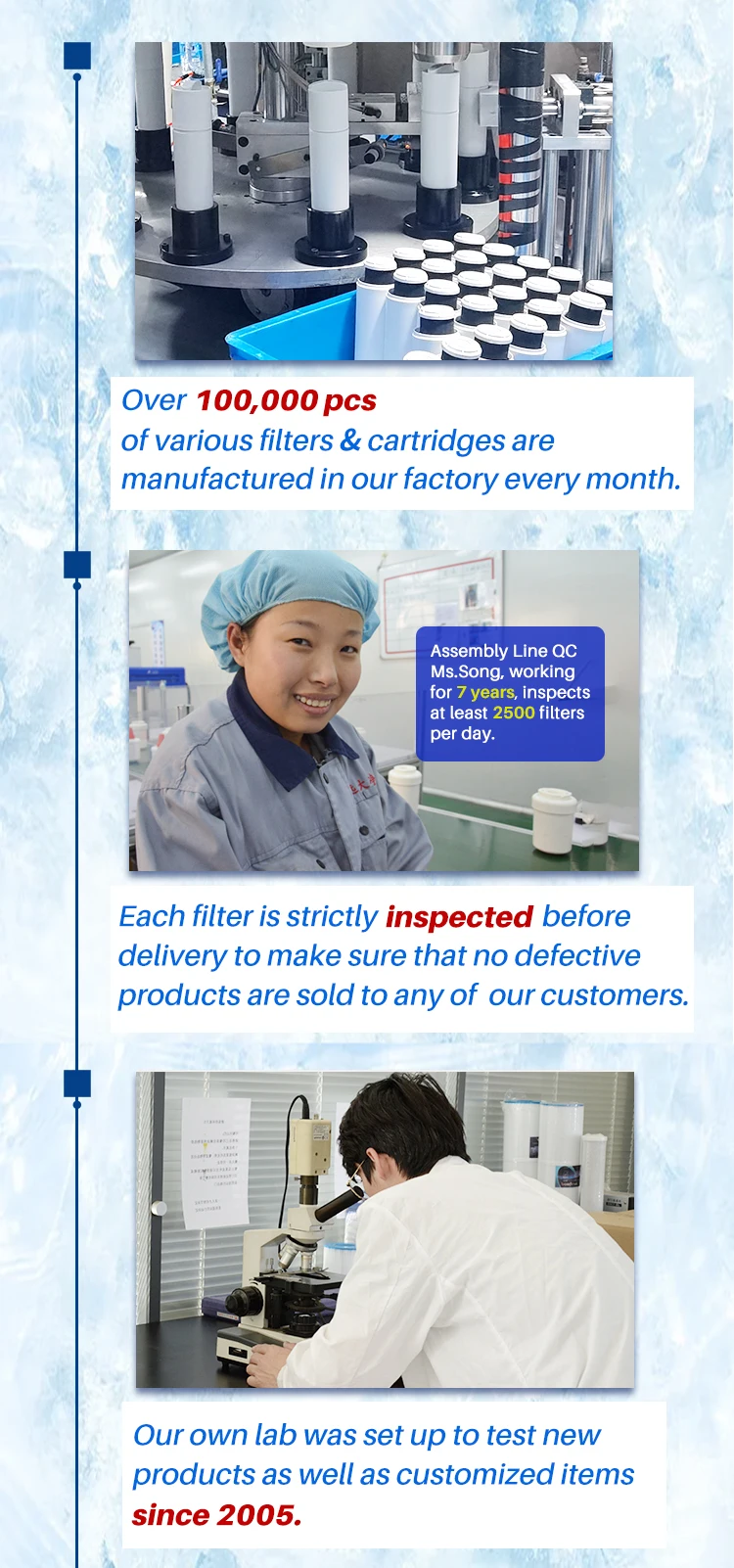 【Strict Quality Control】All products are produced under the ISO9001, 14000 standard and inspected under strict quality control.Each filter is produced through 34 production processes, 375PSI pressure test, 10,0000 water hammer tests, and 6 independent tests. |
