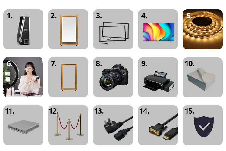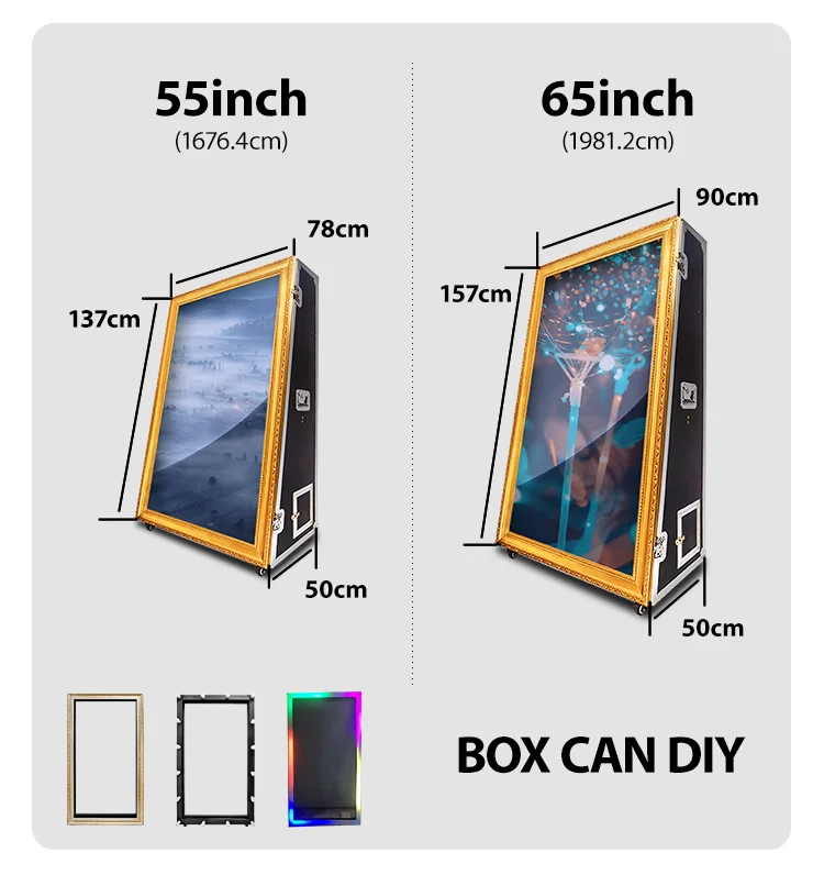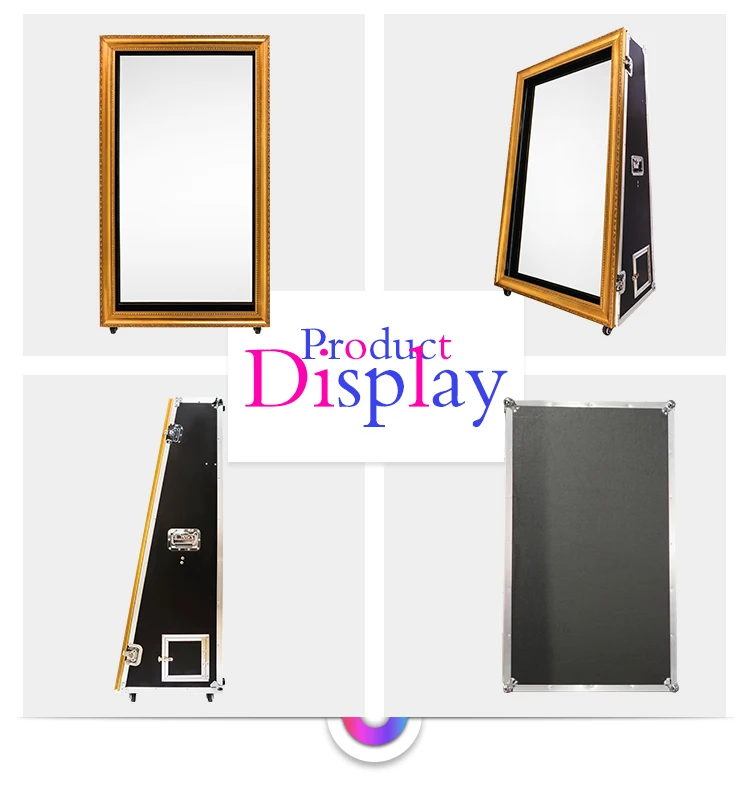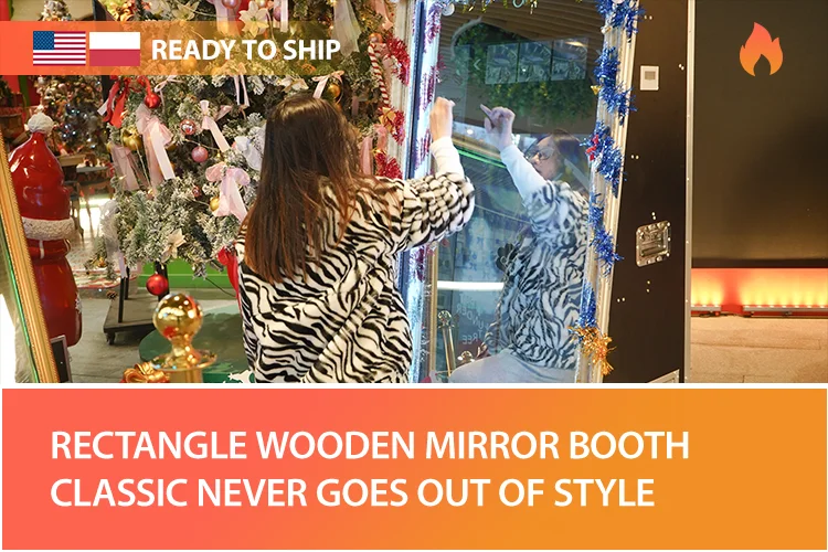 Mirror photo booth is becoming a must be for the parties or wedding. It perfectly suitable with the newest social media. This is the classic style of photo booth, Rectangle Mirror Photo Booth, composed of flight case, mirror, large touch screen and wooden frame. Structure inside is designed perfectly for camera installation and printer placement.