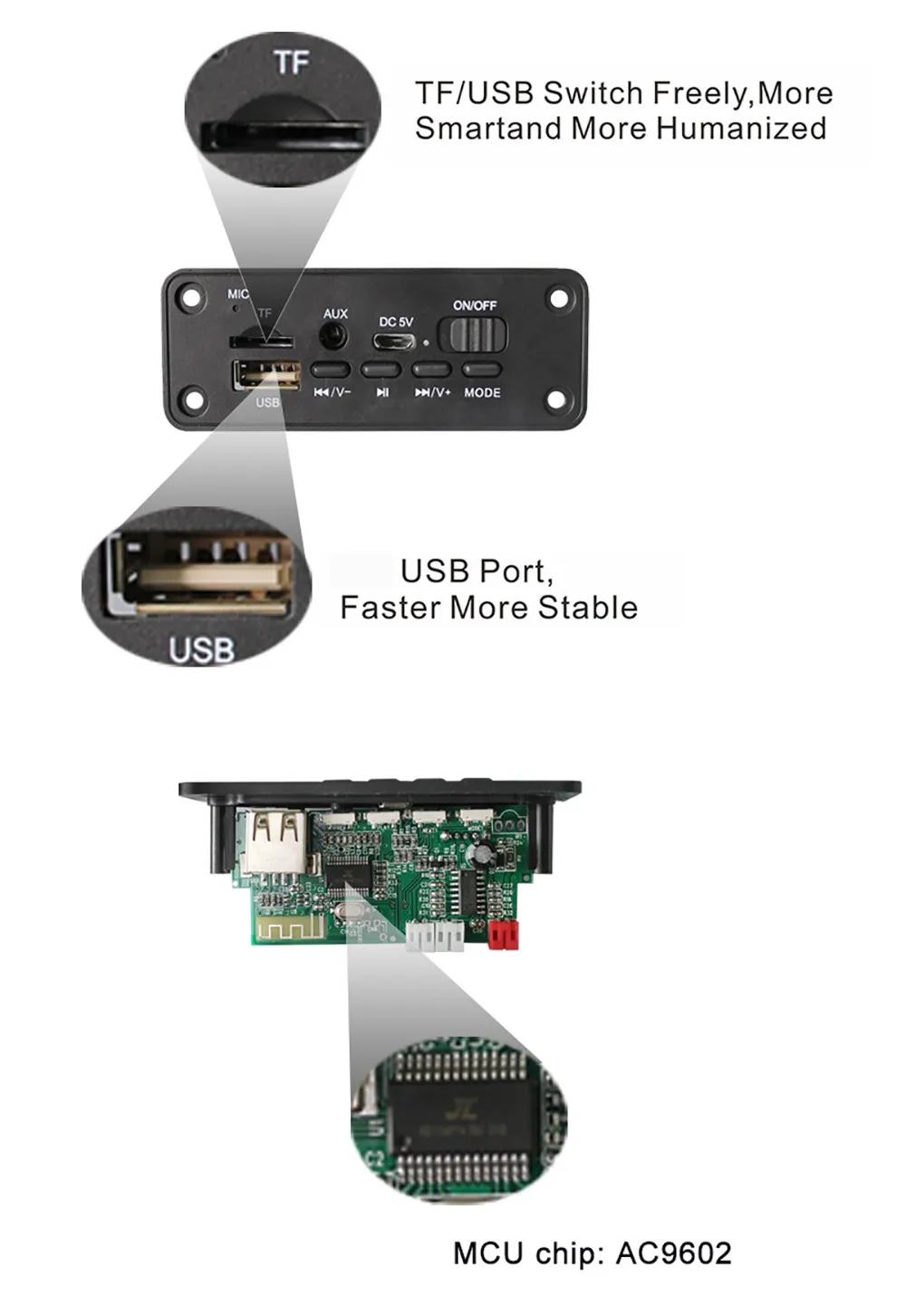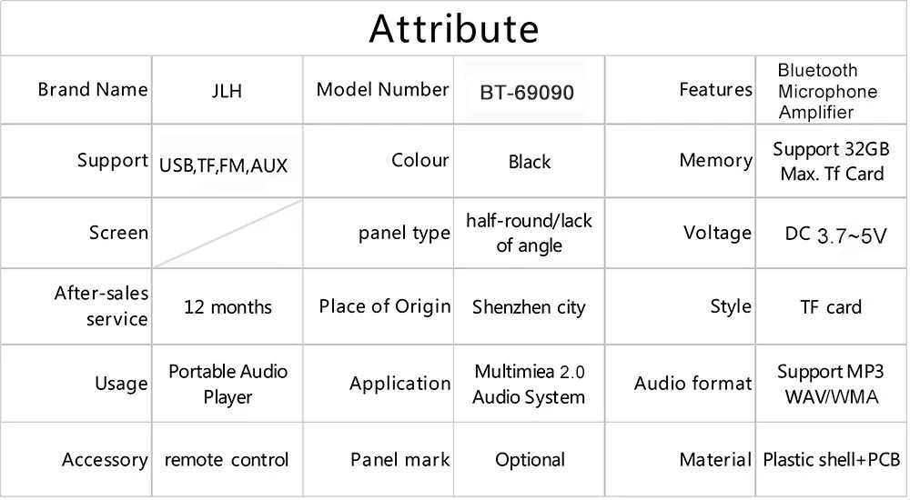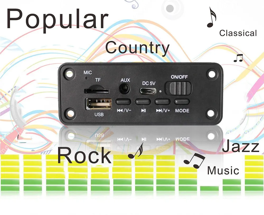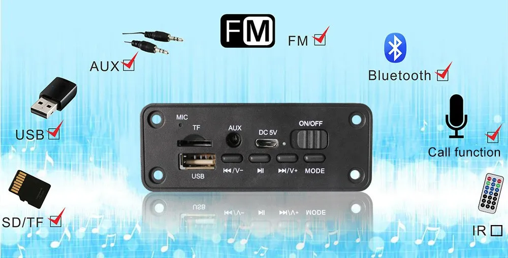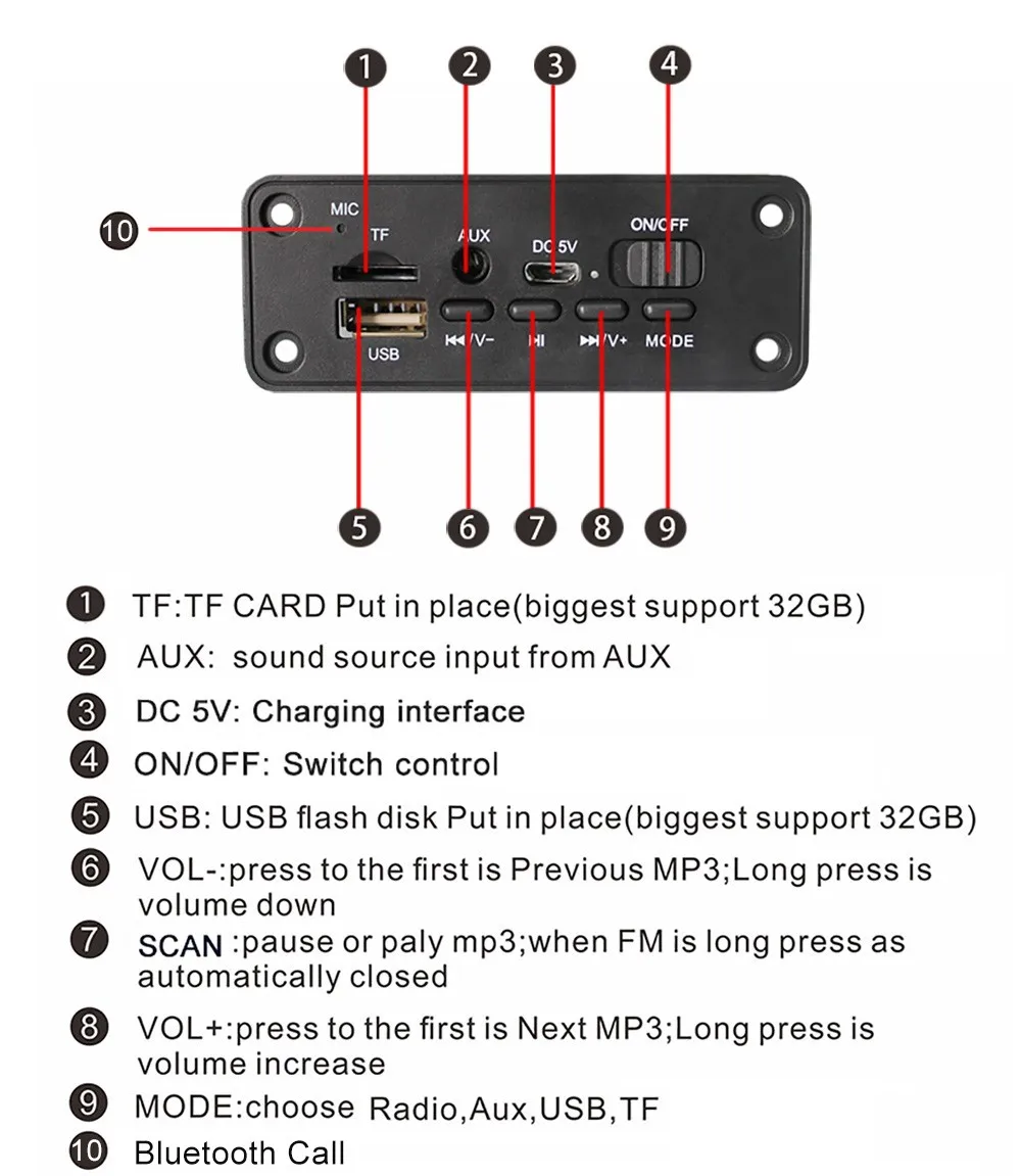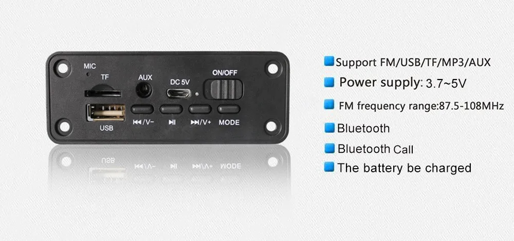Поддержка функции введение: MP3/USB/MICRO SD карта/Bluetooth/усилитель двойной 3W или 5w колонки/выступления микрофон При звонках/черный platicИнтерфейс в постоянный ток питания 3,7 V батарея/включение/выключение/"micro-USB на 5 в постоянного тока" Зарядка для батареи