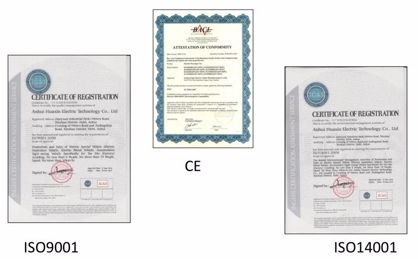 HUAXIN also invests a lot to the production of mould making, jigs and checking moulds to ensure the precise of components, and the key components (Battery, Controller) imported from USA and Japan directly to ensure the performance of the vehicles. HUAXIN follows International Quality Standard to produce, control and inspect the electric vehicles. At present,our company passed the certification ISO9001-2008,ISO14001 and OHSAS18001 helth and safety certification,and CE.