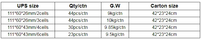 1. Вход: 90 В ~ 250 В переменного тока 2. Выходное напряжение: 24V/48V 3. Емкость: 22.2wh ~ 28.86wh 4. Размер: 140x60x35мм |