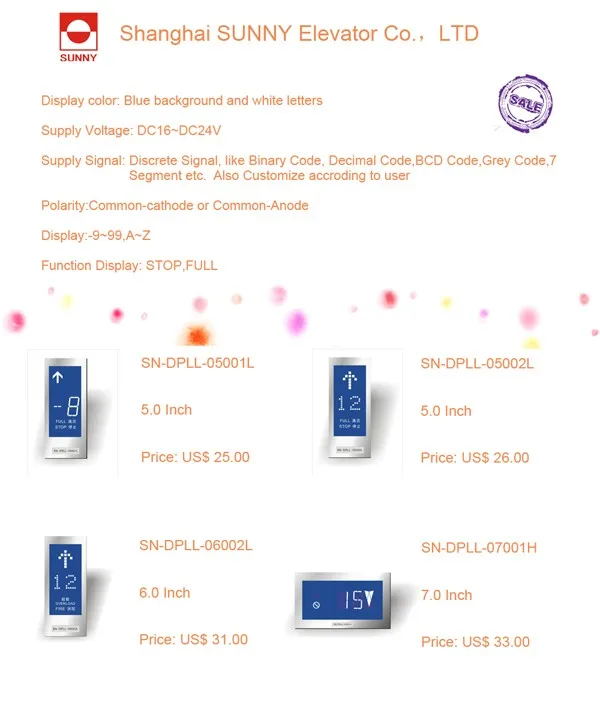 Our main products are: Elevator Buttons, Elevator Light Curtain, Photoelectric Switch, Elevator Display, COP & LOP, Traction Machine , Door Mechanism. And we provide best prices on: Guide Rail, Guide Shoe, Counterweight Filler, Rope fastening, Wire Rope, Safety Gear, Speed Governor, Oil Buffer, Maintenance box, Emergency leveling device, Elevator Intercom, Limit Switch, Fans and other parts for elevator.