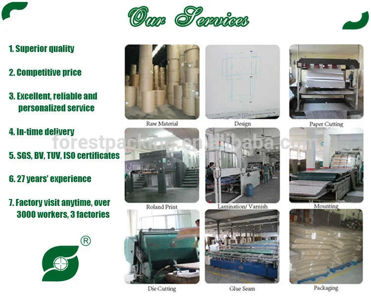 Its main products and services include corrugated board, color surface carton, (offset printing/flexo printing), display box, instruction leaflet, brochure, books and magazine, etc. Forest also sells different grades of customized paperboard, corrugated box directly to many other countries. The business philosophy of "quality first, honest and reliable" wins support from home and abroad. Its market share rate showed an upward increase year by year. Forest exports to more than 200 different countries and areas from year 2005. 10 years of international trade history gains high reputation from all over the world.