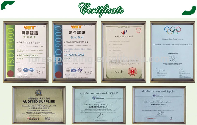 Forest is dedicated to establish a safe, green, eco-friendly core component and production system. It was awarded Packaging and Decoration Printing Permit, Trademark License Printing Admission Certificate, Export Packaging Quality Certificate, Dangerous Product Packaging Certificate, etc. by the government. In the meantime, Forest passed ISO9000 Quality System Certification and ISO14000 Environment Certificate. From May 2004, the implementation of ERP production control system assisted Forest further improve its management level. Trademark "Forest" & "Forest Brand" corrugated box were recognized as famous trademark & product in Zhejiang "AAA" good contract and credit keeper enterprise in 2006. Thereafter, Forest ascended TOP 10 Industrial enterprise in Wenling and China Top 100 printing enterprise. Forest becomes famous brand in Chinese packaging field.