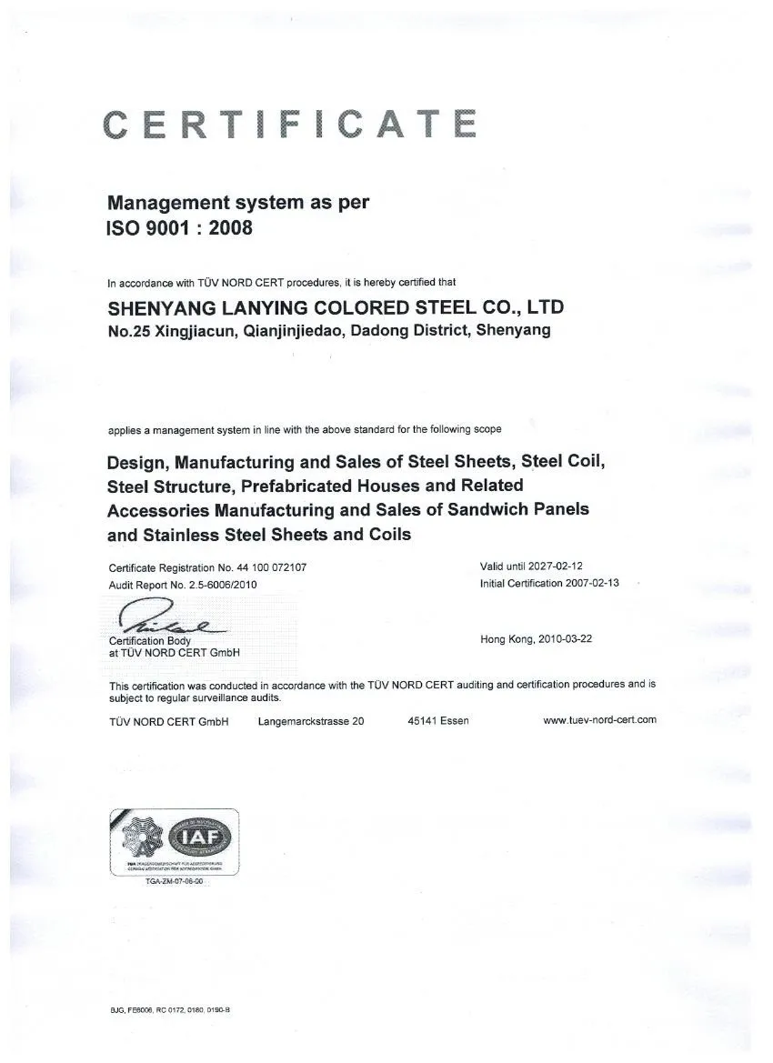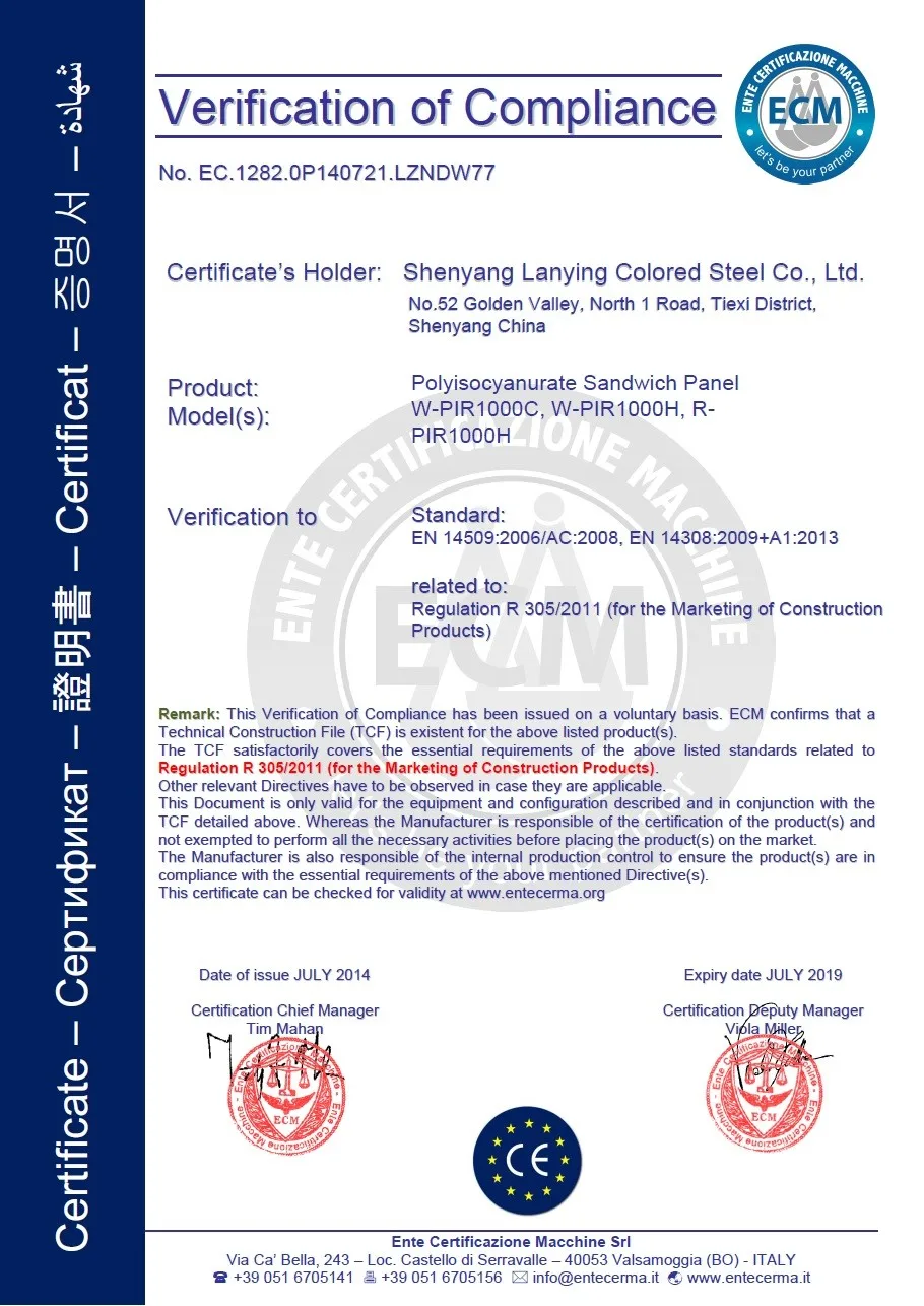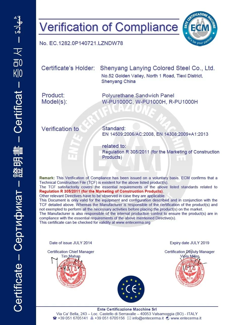 Система облицовки | EPS, PU, стекловолокно и минеральная вата сэндвич-панелей или гофрированного стального листа с волоконно-стекловолоконной изоляцией. Доступно в различных цветах и датчиках |