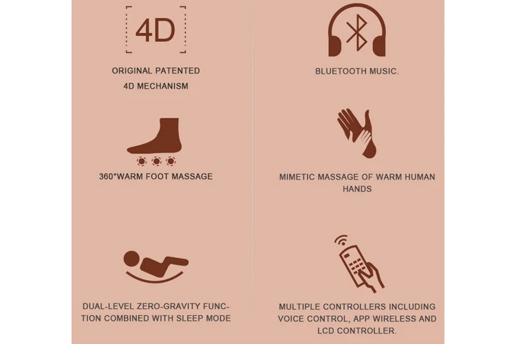 5. Dual-level zero-gravity function combined with sleep mode | 6. Multiple controllers including voice control,App,wireless and LCD controller |
