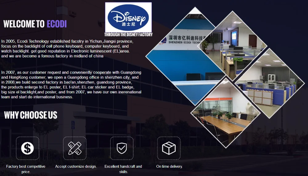 Shenzhen Ecodi Technology Co; Ltd предоставляет электролюминесцентные товары с более чем 12 летним опытом, Мы ориентированы на EL, профессиональный для EL, просто сделать EL для мирового рынка. такие как футболка EL, электронная маска, EL tie, толстовка с капюшоном, EL sheet, электронный постер, EL wire, EL tape и т. д.
