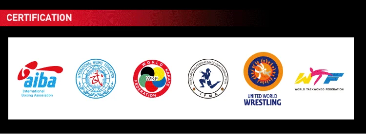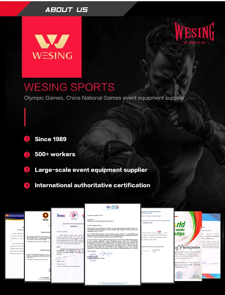 Fujian Weizhixing Sports Goods Co., Ltd. implements ISO9001:2000 standards. Our products have won approvals of AIBA, International Wushu Federation, Asian Karate Federation, Chinese Taekwondo Association, Chinese Boxing Association, Chinese Wushu Association, Chinese Karate Association, Chinese Judo Association, and Chinese Wrestling Association. Our boxing rings, gloves and helmets have successfully passed the standard inspection of the AIBA authoritative testing institute. We are the designated supplier for Karate serial products by Asian Karate Federation.