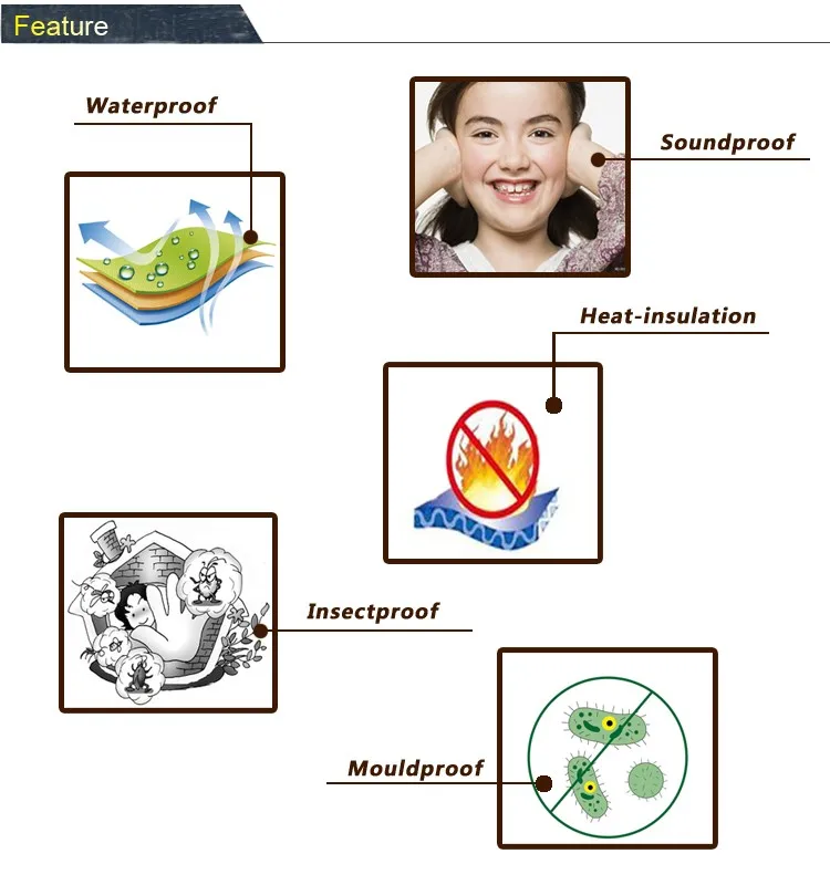 Особенности: | 1. Водонепроницаемость, теплоизоляция, защита от плесени, влагонепроницаемость, экологичность, защита от насекомых, защита от вращения, защита от влаги, 2. Цвет и дизайн могут быть настроены 3. Быстрая доставка и профессиональная посылка 4. легко чистить и устанавливать 5. используется более 30 лет 6. Экономический и легкий вес | ||