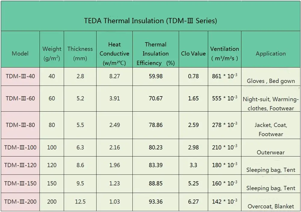 - TDM-III Series TEDA Thermal insulation meets the standard Type B according to GB 18401-2003( The National General Safety Technical Code for Textile Products).
