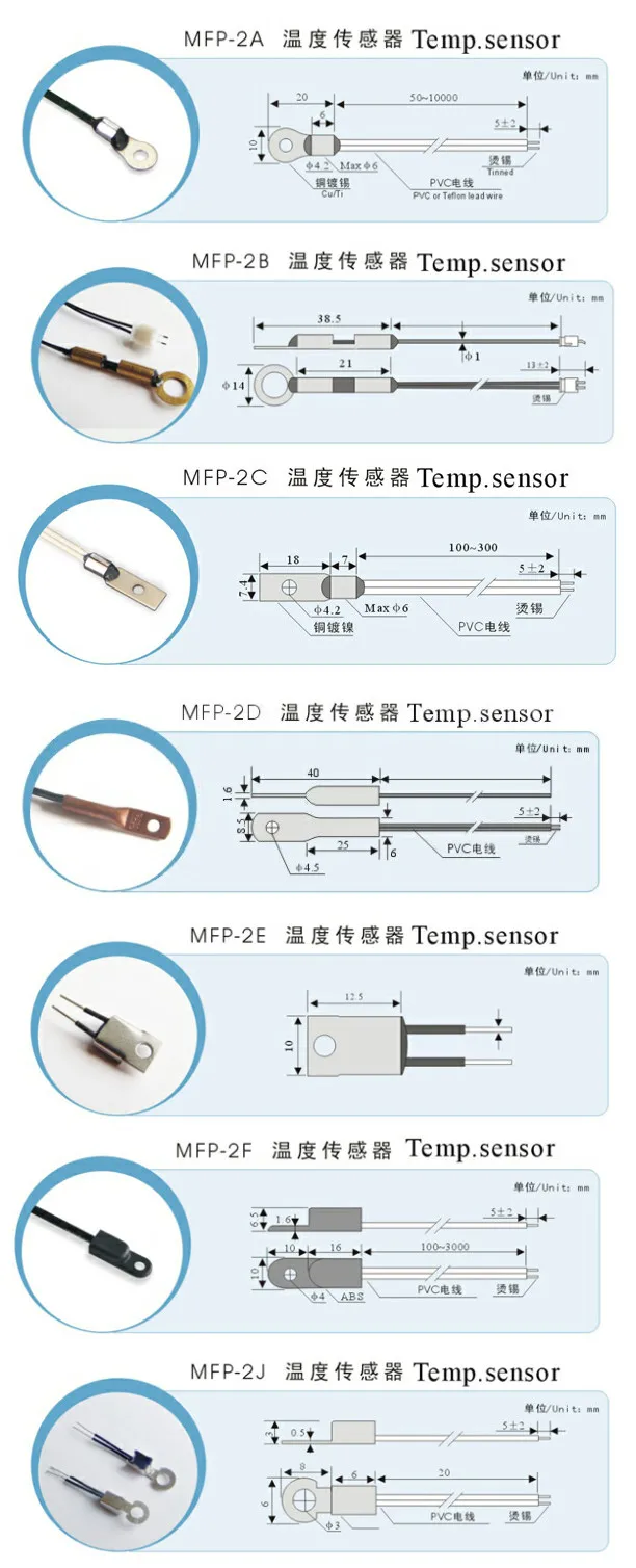 Кольцевой наконечник NTC термистор поверхностные датчики температуры предназначены для винтового крепления. Большинство этих корпусов температурного зонда являются стандартными кольцевыми клеммами или кольцевыми наконечниками с термистором, горшенным в бочке наконечника, популярным для измерения температуры, контроля и мониторинга малых двигателей, теплообменников, компьютерное оборудование, электроэлектроника, полупроводниковый контроль температуры теплоотвода, панели корпуса, промышленное оборудование, Автомобильное оборудование и т. д. Они также легко монтируются в инструментах, где требуется защита от перегрева.