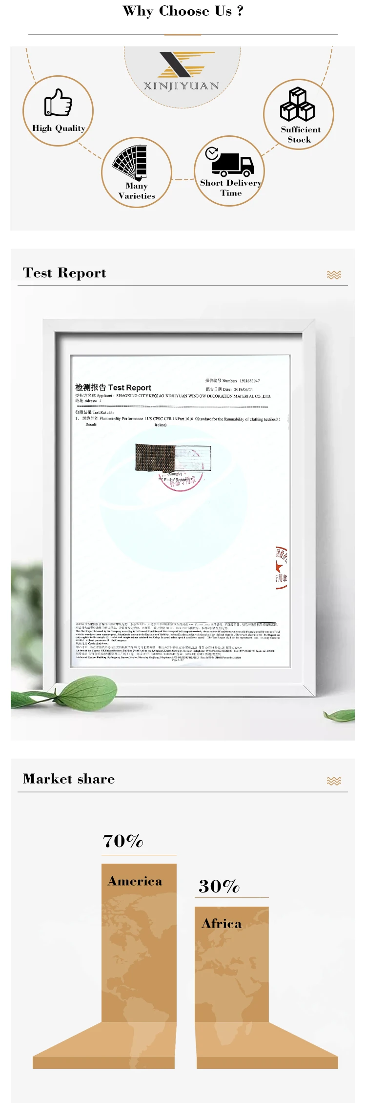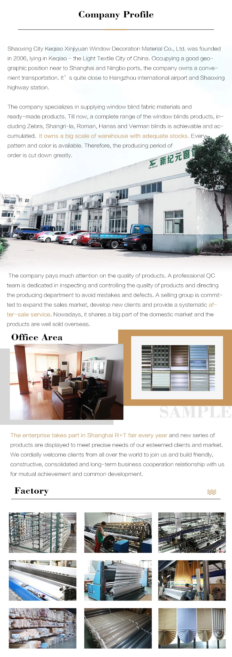 2. Where is your factory? Our factory locates in Keqiao textile market, Shaoxing City. 3. Do you sell fabric or finished complete ready made blinds? We do both. 4. What kind of products do you make? Plain blinds&fabric, Blackout blinds&fabric, Jacquard blinds&fabric, Printing blinds&fabric, Pleated blinds&fabric, Embroidered blinds&fabric. We can do various kinds of window blinds & fabric.