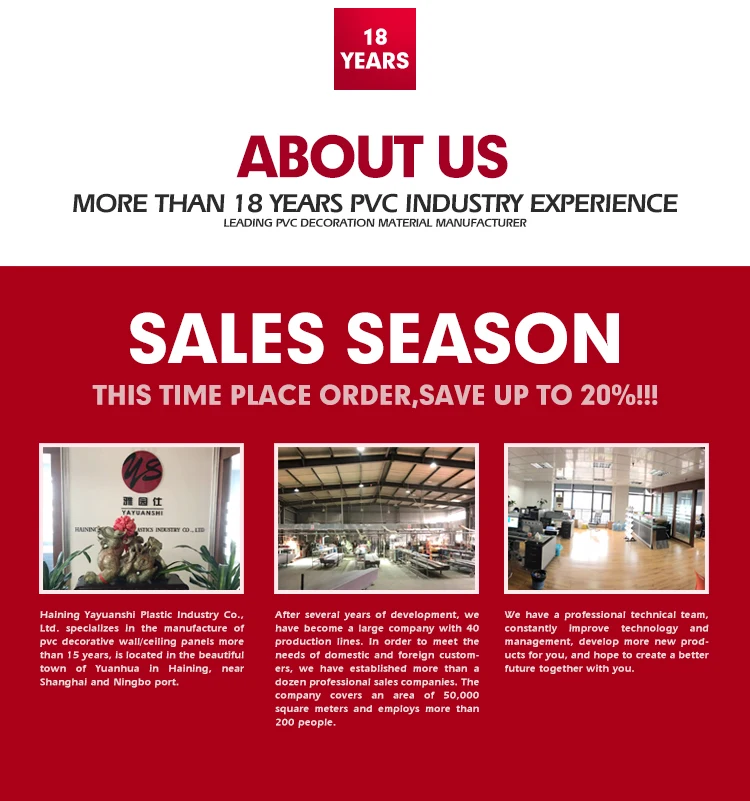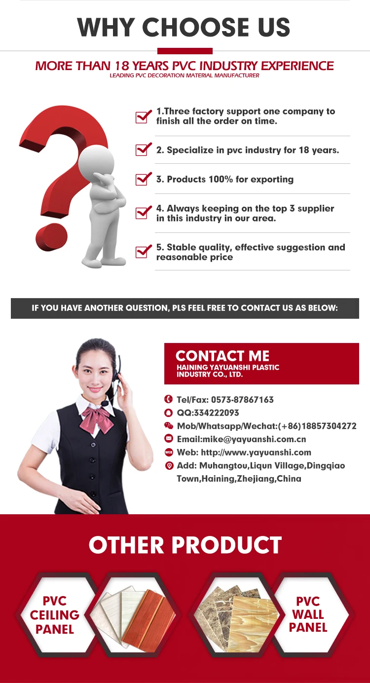 Особенности | 1. Продукты очень популярны на внутреннем рынке и за рубежом 2. Высокая интенсивность противостоит эрозии анти старению 3. Огнеупорные водонепроницаемые ржавчины, влагостойкие, жаростойкие, экологически чистые 4. Легкий вес, легкая установка и чистка 5. Подлинные деревянные зерна деревянный цвет ПВХ потолочные панели |