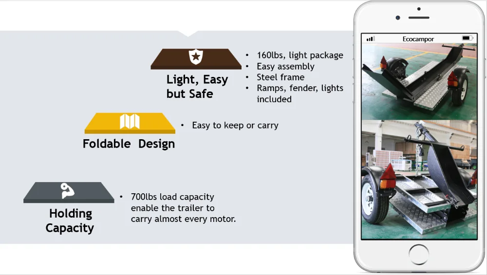 Moving a motorbike isn't always an easy undertaking. Luckily, Ecocampor offers unique options to ensure you have the right hauler for the job. Ecocampor‘s EC-MT-01 is a durable economy-style motorbike hauler that’s great for all most every motorbike.