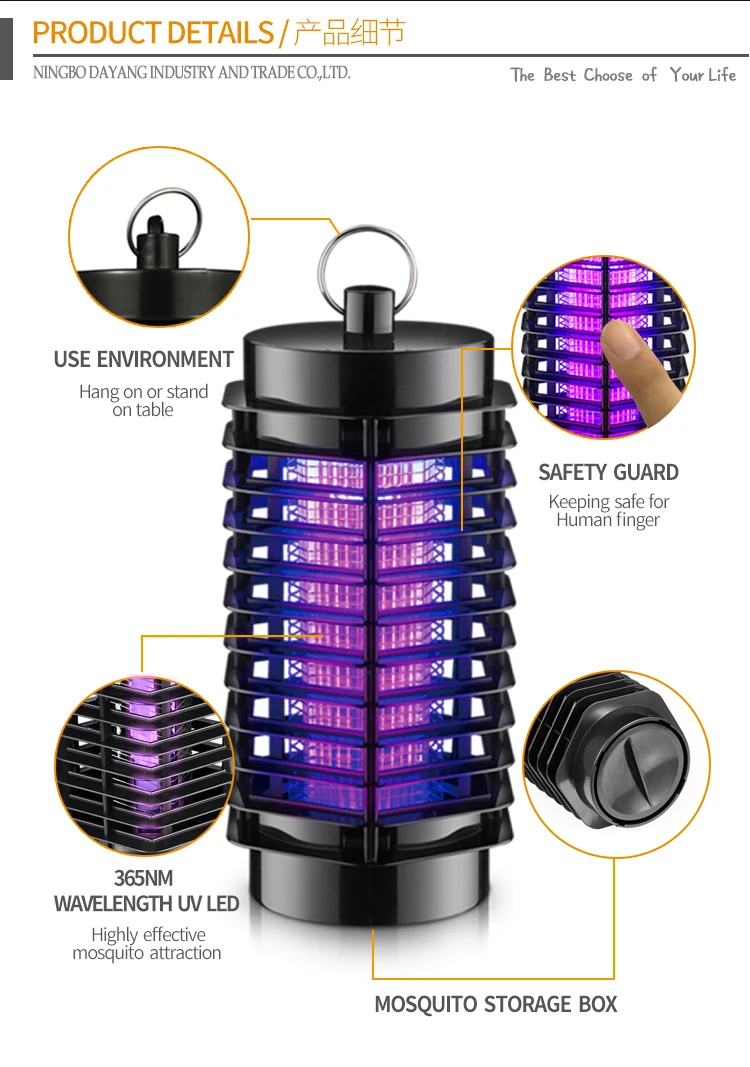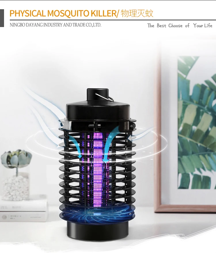 This indoor use mosquito killer lamp has 8 pcs LED with 365nm which is most wave length to attractive mosquito,the high voltage will shock the flies after the boby touch the eletric net.It can use to home,office,shop,etc.