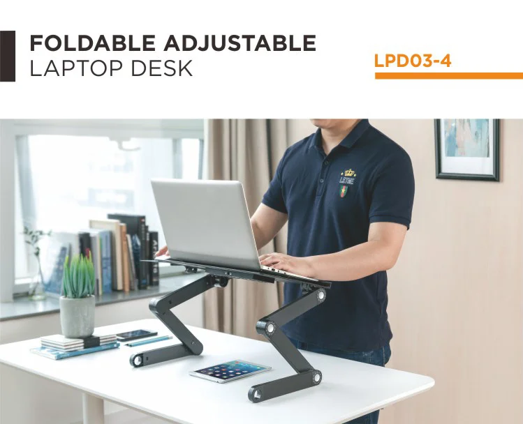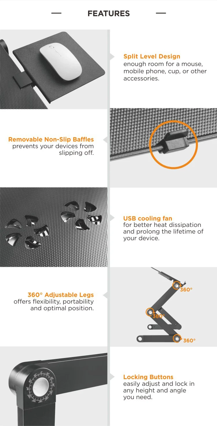 Troubled by pains after looking at laptop for a long time? No longer bend and look down at the computer when you are working on this laptop stand, develop more healthy working sitting/standing position and avoid your vision loss, good for relieve cervical lumbar fatigue and makes your work more effectively. This fully adjustable laptop desk can be folded for portability, you can carry it around. Besides, 360 °Adjustable Legs enables you to use your device at the most comfortable position, which benefits your health and helps alleviate the neck ache and shoulder pain caused by poor posture. USB cooling fan for better heat dissipation and prolong the lifetime of your device. Our laptop stand can also be used for bed/sofa lap tray, office laptop stand, a TV dinner tray, standing desk, book tray, writing desk and tablet holder.