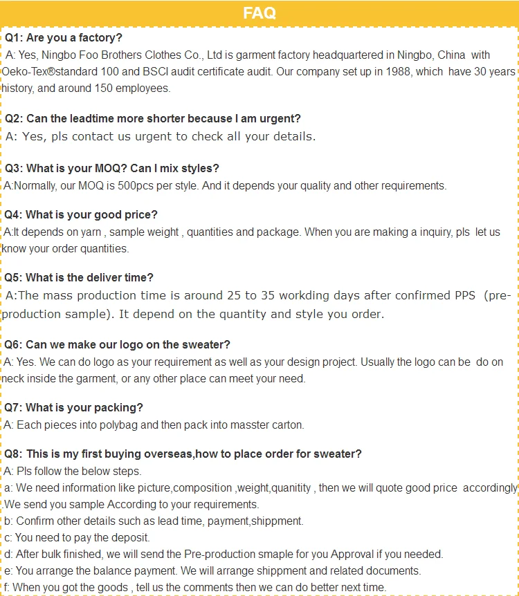 Ningbo Foo Brothers Clothes Co., Ltd is garment factory headquartered in Ningbo, China with Oeko-Tex®standard 100 and BSCI audit certificate. Annual Sales revenue in last five years is approximately US dollar 10 million.
