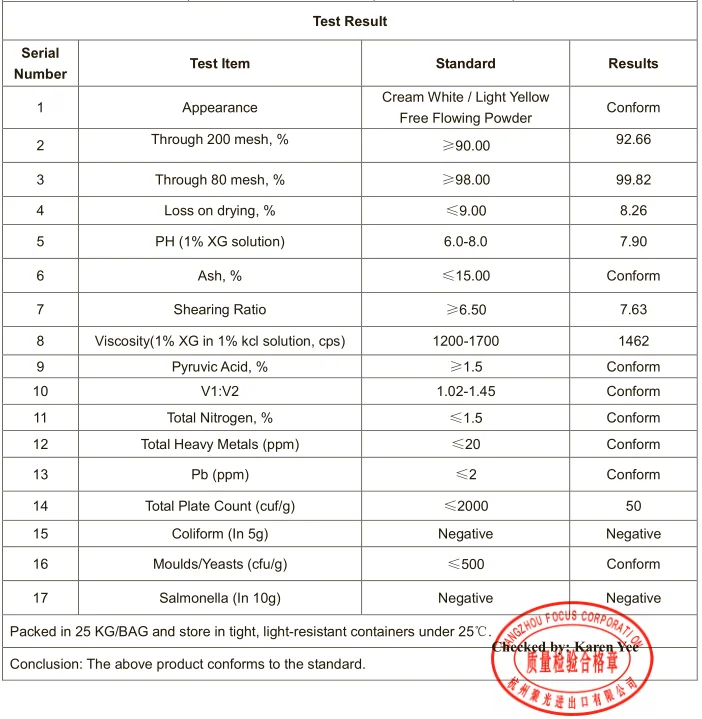 Пищевой 80mesh | 80 пищевая сетка, мешок ксантан, нормальные частицы. | Используется в заправке, соусе, замороженных десертах, напитках, хлебобулочных товары иях и т. д. |
