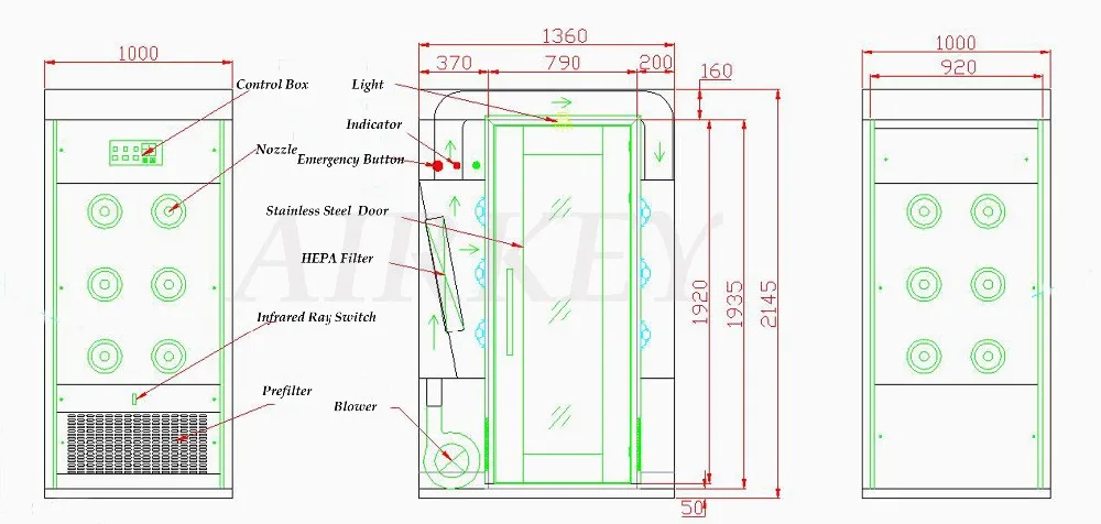 Воздушный ДушЭто часто Использованное оборудование в чистой комнате. Эффективно удаляет частицы пыли на поверхности товара, чтобы пыль не попадала в чистую комнату товарами. Между тем, воздушный Душ работает как воздушный замок, который отделяет чистую область и нечистую область, чтобы держать давление в чистой комнате устойчивым.