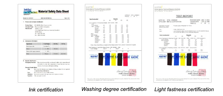 1. Color: the imported thermal sublimation ink is more colorful and realistic than the domestic ink.In particular, black ink, the transfer effect is to be a bit gray or reddish, not as bright as imported ink.