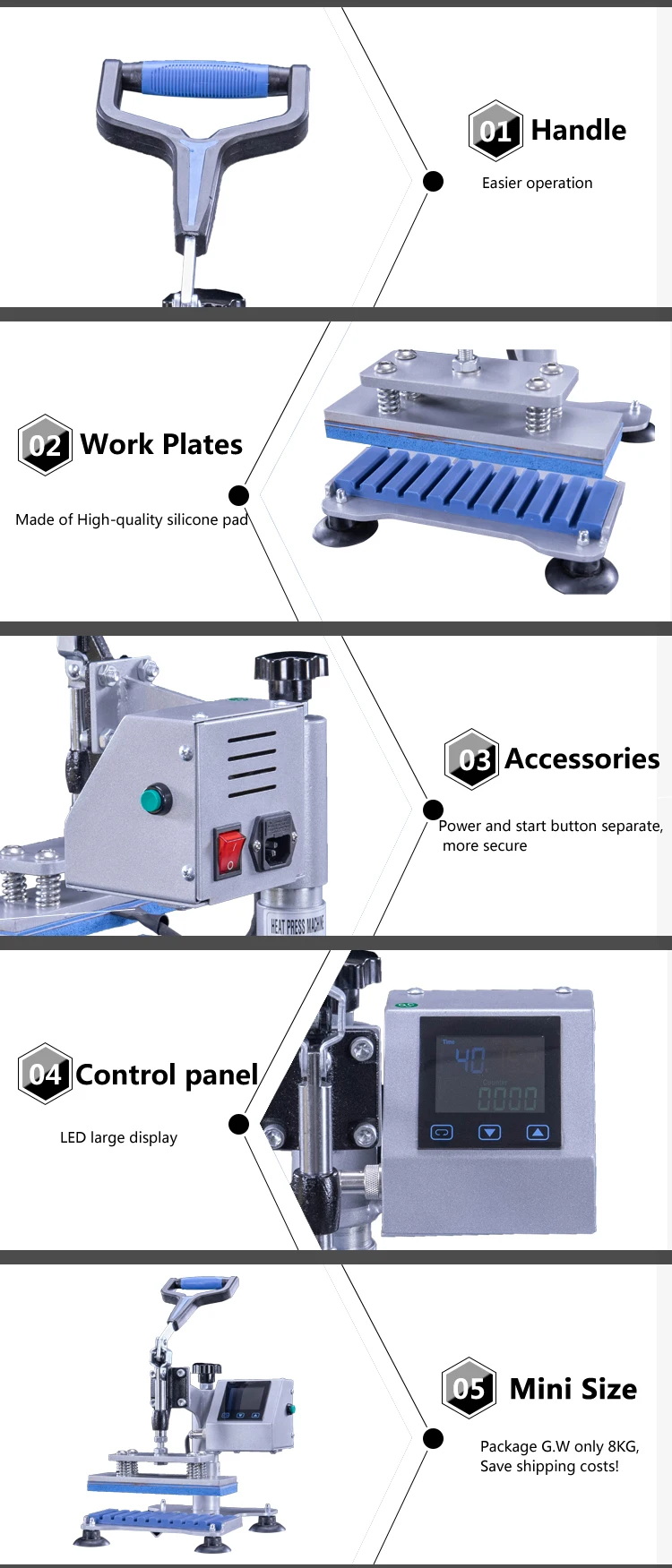 A heat press is a machine engineered to imprint a design or graphic on a substrate, such as a t-shirt, with the application of heat and pressure for a preset period of time. While heat presses are often used to apply designs to fabrics, specially designed presses can also be used to imprint designs on mugs, plates, jigsaw puzzles, caps, and other products.this machine is designed for heat transfer artwork onto flat item,t shirt mouse pad tiles.