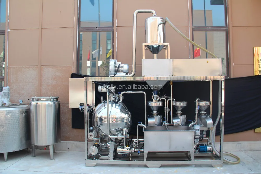 Main parts of the machine: soybean cleaning and soaking system, vacuum suction conveying soybean system, frequency transforming for grinding system, constant pressure feeding quantitative water system, filtering and purifying water system, on-line soya-bean milk concentration detecting and adjusting system, high pressure stirring and cooking soybean slurry system, CIP cycle cleaning machine system, automatic controlling temperature and pressure device, PIC program module memory system, colorful human-machine interface operation system.