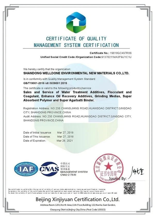 ISO9001: 2015 для качества супер абсорбирующего полимера