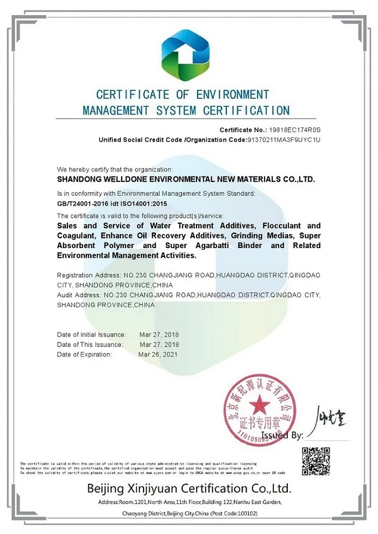 ISO14001: 2015 для защиты окружающей среды супер абсорбирующего полимера