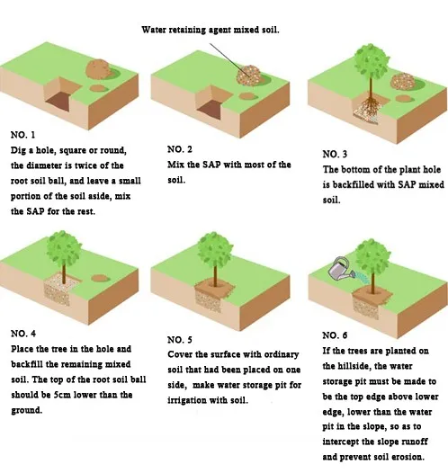 Использование 10-20 г Супер абсорбирующего полимера может вдвое увеличить выживаемость молодых деревьев при посадке саженцев деревьев.