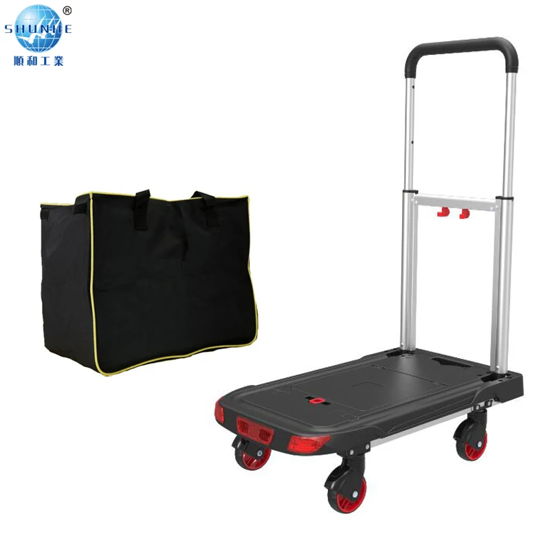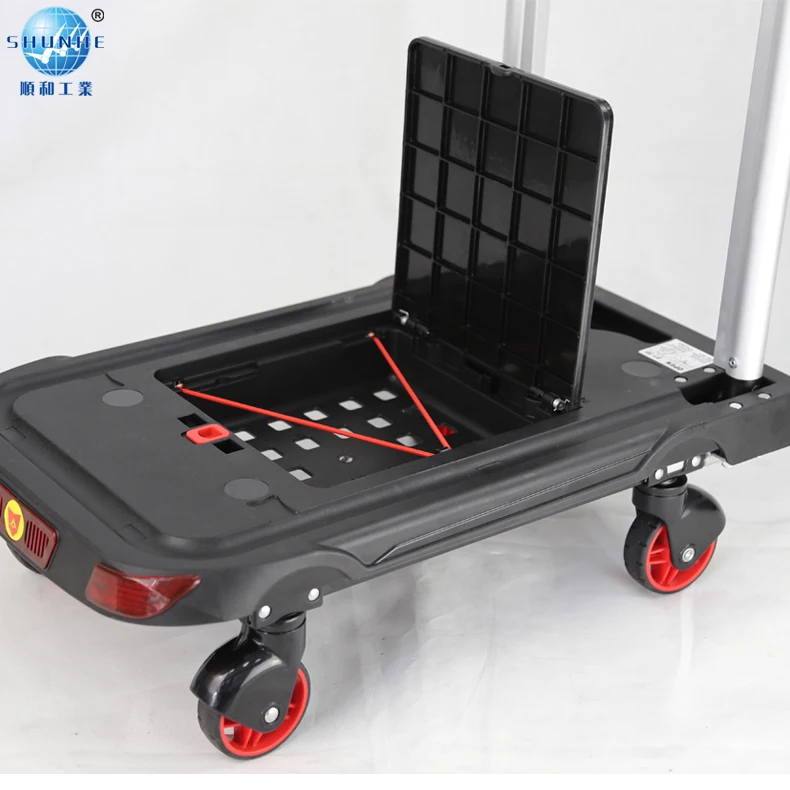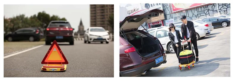 This is a folding four-wheel aluminum handy truck,which is made of durable steel and lightweight and durable polypropylene.It is widely use for shopping ,carrying water, moving etc, which can free our hands, makes the long-distance transport easily and safety, in addition, it can also use as a warming board, because it install with SOS light and triangle board, when your car stuck on the highway,it can help us to avoid the accident.