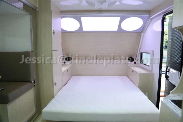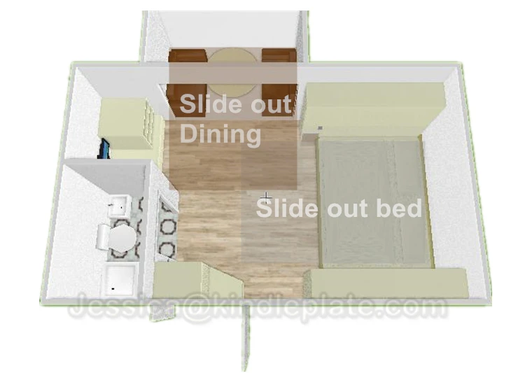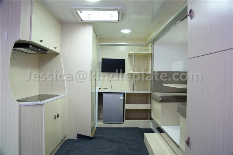 ![]() | A. Регулируемый обеденный стол B. 24 "ЖК-телевизор C. Холодильник + дезинфекционный шкаф D. Односпальные кровати вверх и вниз Е. Барабанная стиральная машина F. Двуспальная кровать G. Кухня H. Санузел |