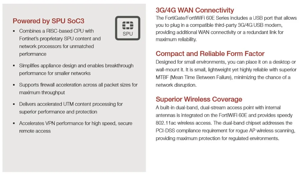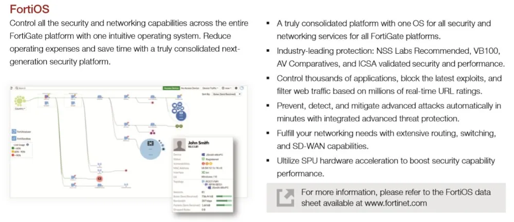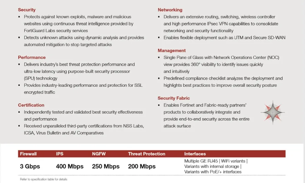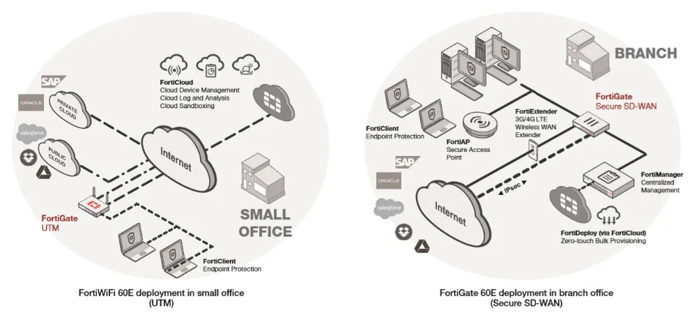 The FortiGate 60E series offers an excellent network security solution in a compact fanless desktop form factor for enterprise branch offices and mid-sized businesses. Protect against cyber threats with industry-leading secure SD-WAN in a simple, affordable and easy to deploy solution.