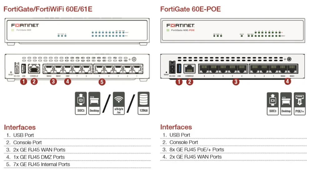 10 x GE RJ45 ports (including 2 x WAN Ports, 1 x DMZ Port, 7 x Internal Ports), 128GB SSD onboard storage. Max managed FortiAPs (Total / Tunnel) 10 / 5