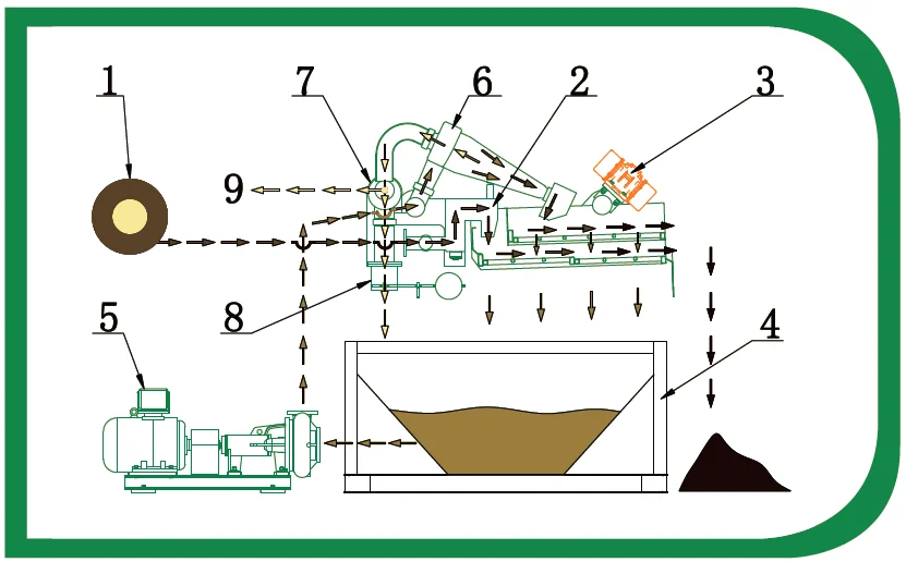 Шламовый насос высасывает грязь из грязевой ямы, чем входит в нижний слой экрана шейкера (3) через буферную коробку (2), грубые частицы будут отделены и поток грязи в бак для хранения грязи (4) через нижний слой экрана шейкера сланца (3). Центробежный насос (5) принимает грязь из рециркулирующего бака (4) и подаёт в десандр конус (6) с давлением для центробежного разделения, твердые частицы/песок был разряжен в верхний шейкер (3) от выпускного ниппеля десантерного конуса. После обезвоживания верхних шейкеров (3) тонкие твердые вещества были отделены. Грязь прошла верхний экран шейкера возвращается обратно в бак рециркуляции (4), чистая грязь входит в промежуточный бак (7) через десандер конуса перелива трубы. Грязь в промежуточном резервуаре (7) будет выходить через выпускную трубу (9) или вернуться к резервуару для переработки (4) зависит от уровня жидкости в резервуаре для переработки.