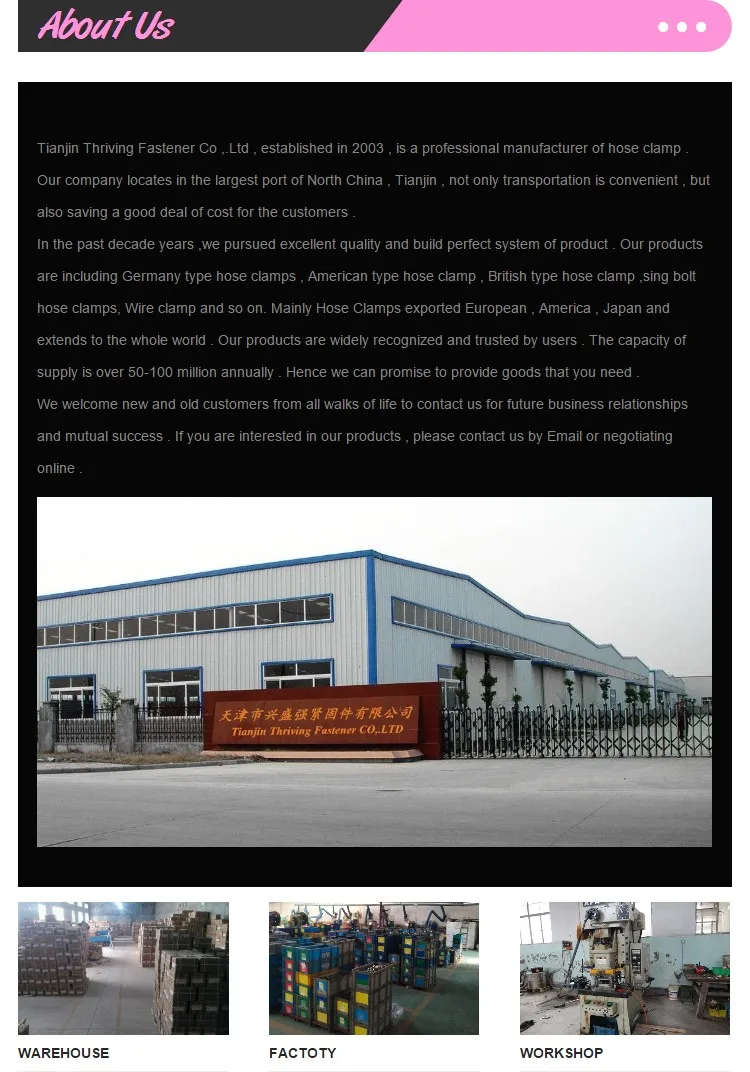 A:We are hose clamp factory in Tianjin,China.