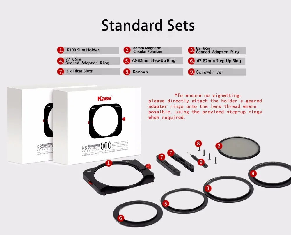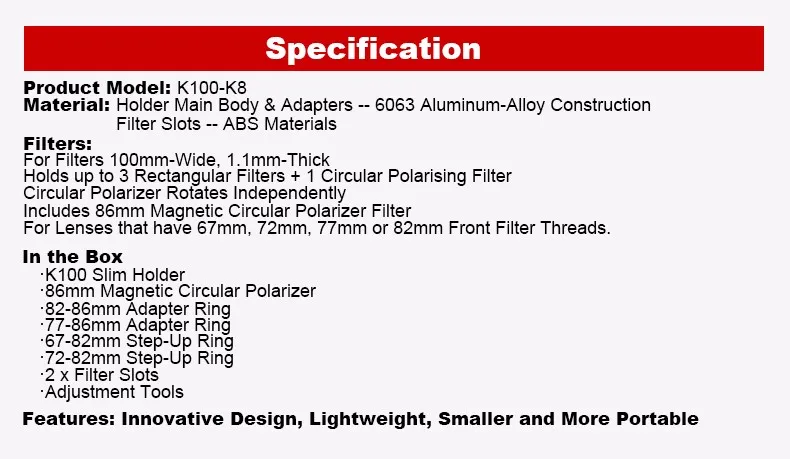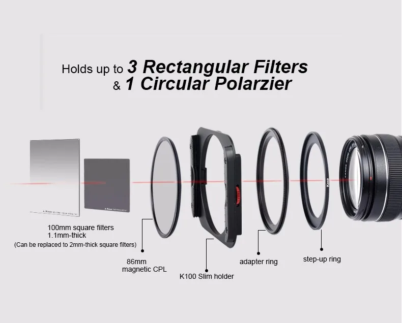 1. K100-Slim держатель фильтра2. редукторные кольца адаптера: 77-86 мм и 82-86 мм-магнитные 3. ступенчатые кольца: 67-82 мм и 72-82 мм 4. Магнитный CPL Slimline 86 мм (поляризационный фильтр) 5. доступны 2 мм и 1,1 мм Слоты фильтра-2 мм поставляются в качестве стандарта.