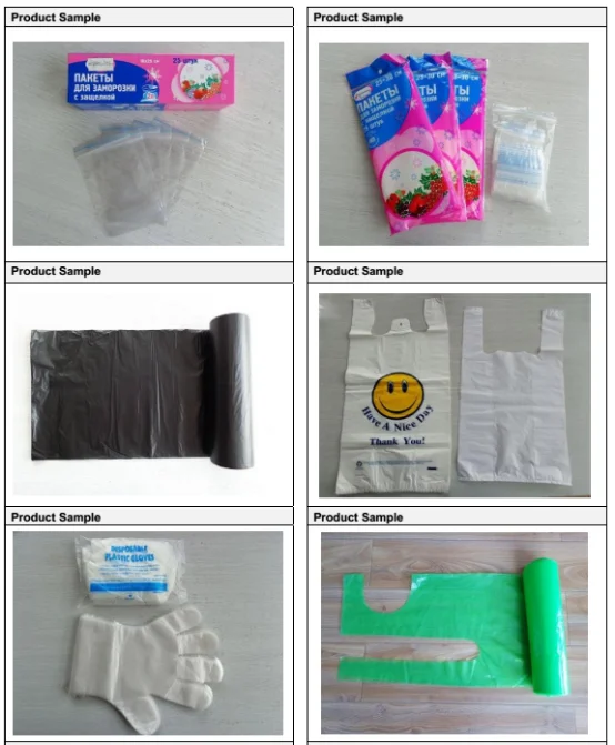 LDPE zipper bag , HDPE disposable Glove , HDPE/LDPE plastic aprons, Garbage bag , T-shirt bag , die cut bag , loop handle bag , plastic nappy bag , doggy poo bag , laundry bags , etc