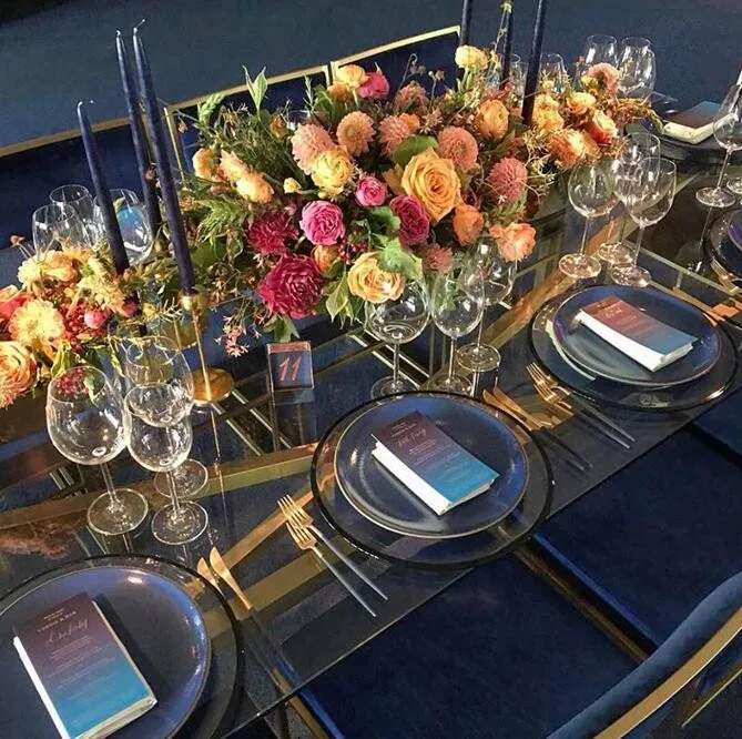 Стеклянный топ золотой свадебный обеденный стол из нержавеющей стали
