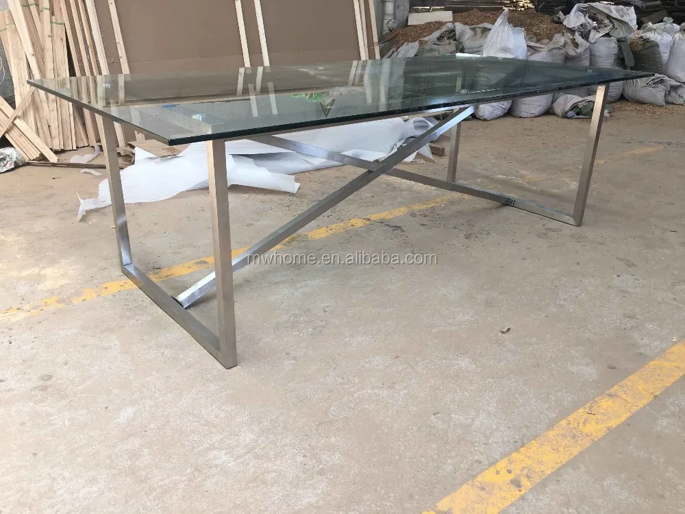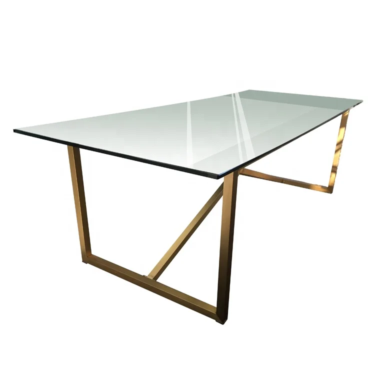 Популярный простой стиль прямоугольной формы матовый золотой обеденный стол из нержавеющей стали с закаленным стеклянным верхом