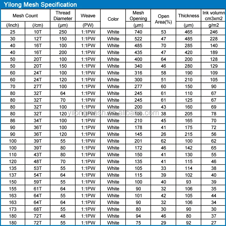 Yilong Mesh Co.,Ltd produces wide range of mesh count from 10T to 165T, and the maximum width can reach 350cm. It can meet most of your screen printing needs.