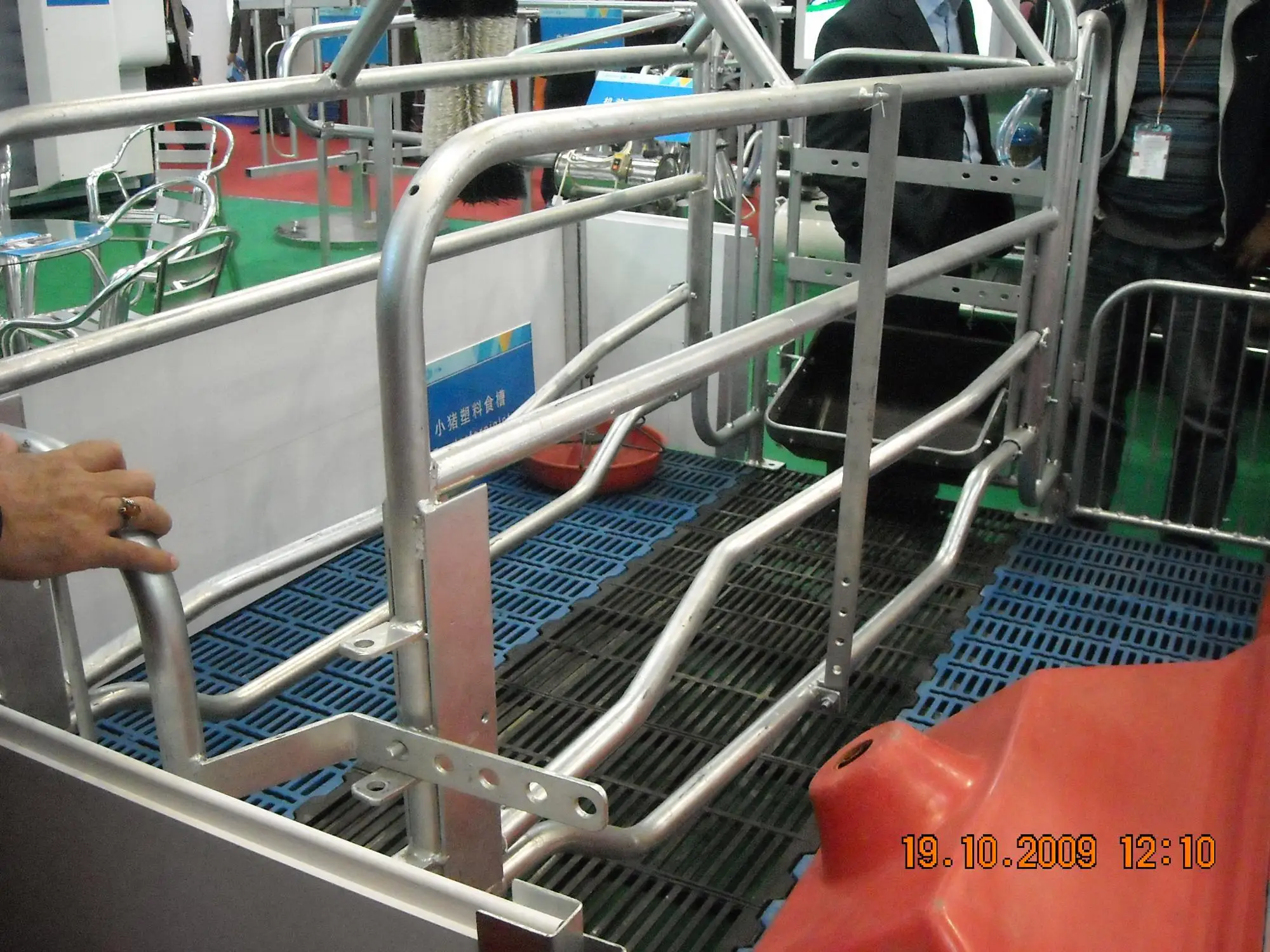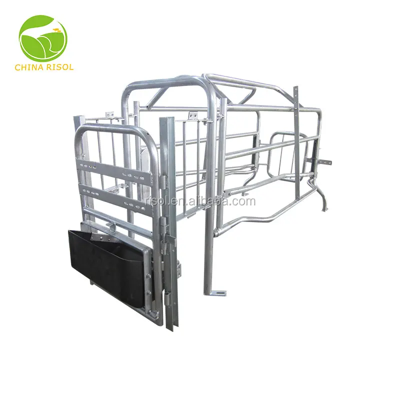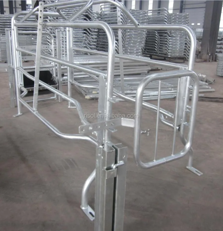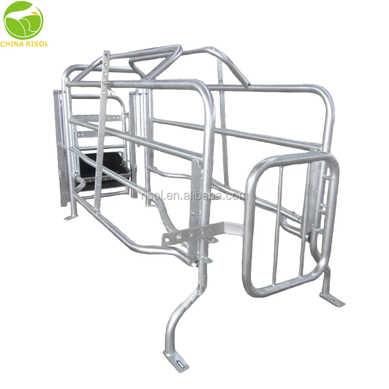 2) The sow crate main frame is completed 1 inch galvanized pipe excluding back door with solid round steel bar. The 1 inch steel pipe thickness is 2.75(2.5)mm with completed hot-dip galvanized pipe processing.It is including 2 pieces adjustable anti-pressing bars, 2 pieces adjusting mechanism, adjustable rail and the adjustable back door of crate.