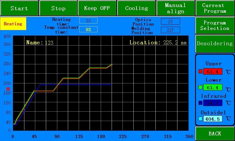 2) Manage the temperature profile: Setting, Storage, Apply, Analysis, Debug. Up to 8 segments temperature control, 50,000 profile groups storage for different BGA's rework task.