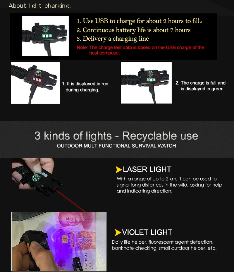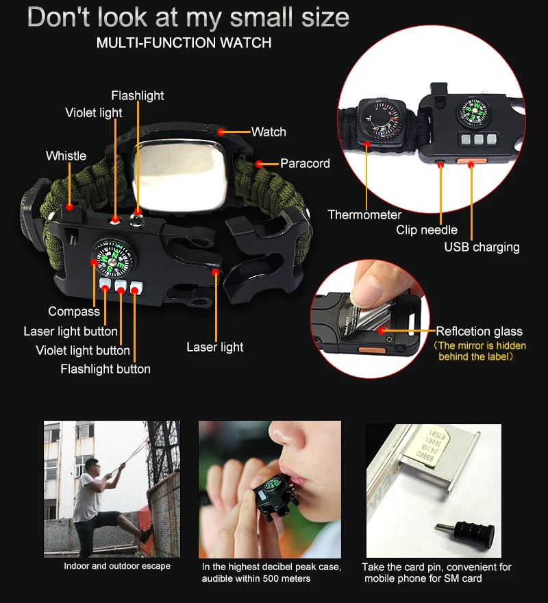 16 в 1 функционал: разводит костер за считанные секунды. Термометра. Компас. Свисток для вызова помощи, когда нет сигнала сотового телефона. Охотитесь за едой с помощью рыболовных крючков и используйте Паракорд, чтобы установить временное укрытие или сделать шнур для скалолазания. Несет в себе все показатели того, что вам нужно в чрезвычайной ситуации.