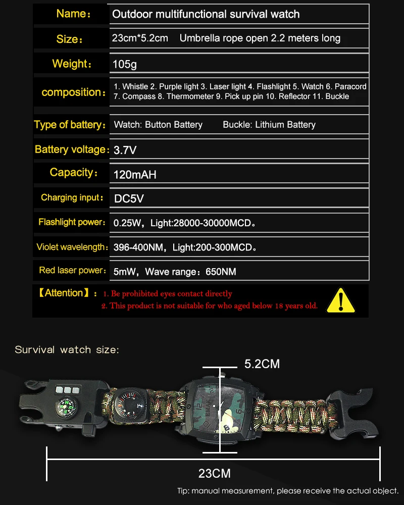 Высочайшее качество и ручная работа и водонепроницаемость-изготовлено из более 9 футов 250 фунтов. Военный нейлоновый Паракорд! Данная модель часов runs9 дюймов в длину вокруг запястья и большого размера. Наши выживания часы изготовлена исключительно для отдыха, легко крепится на запястье.
