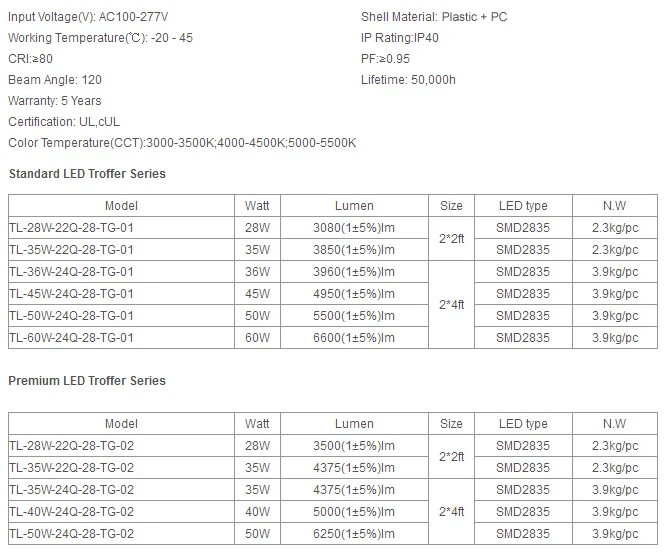Характеристики продукта UL LED Troffer Light: