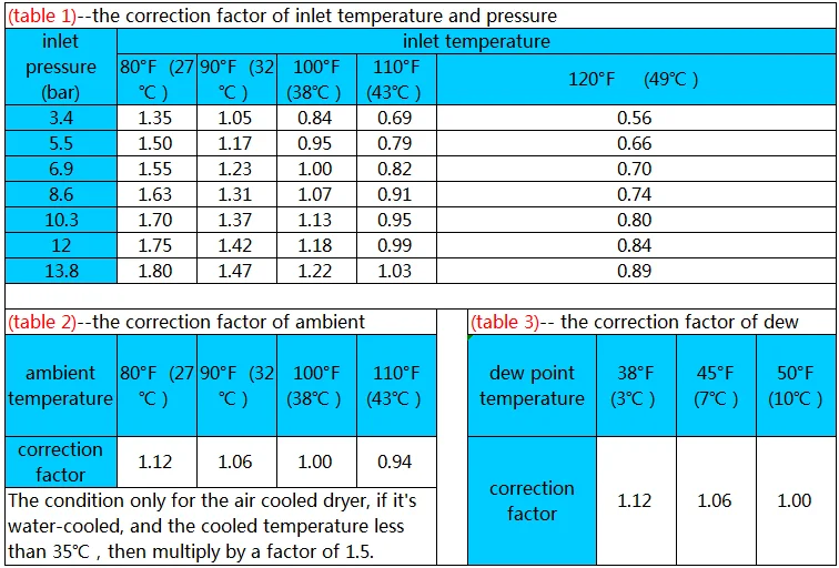 Для того чтобы выбрать РЕФРИЖЕРАТОРНЫЙ осушитель воздуха правильно, вы должны учитывать фактические сжатого воздуха скорость потока, водяной насос для глубоких скважин, давление на входе, температуру на входе, ambiant температуры и запрос в форме капли росы; Пользующийся широкой популярностью среди. Таким образом, мощность = компрессор FAD÷ (таблица-1)÷ (таблица 2) Д х Ш х В (таблица 3)