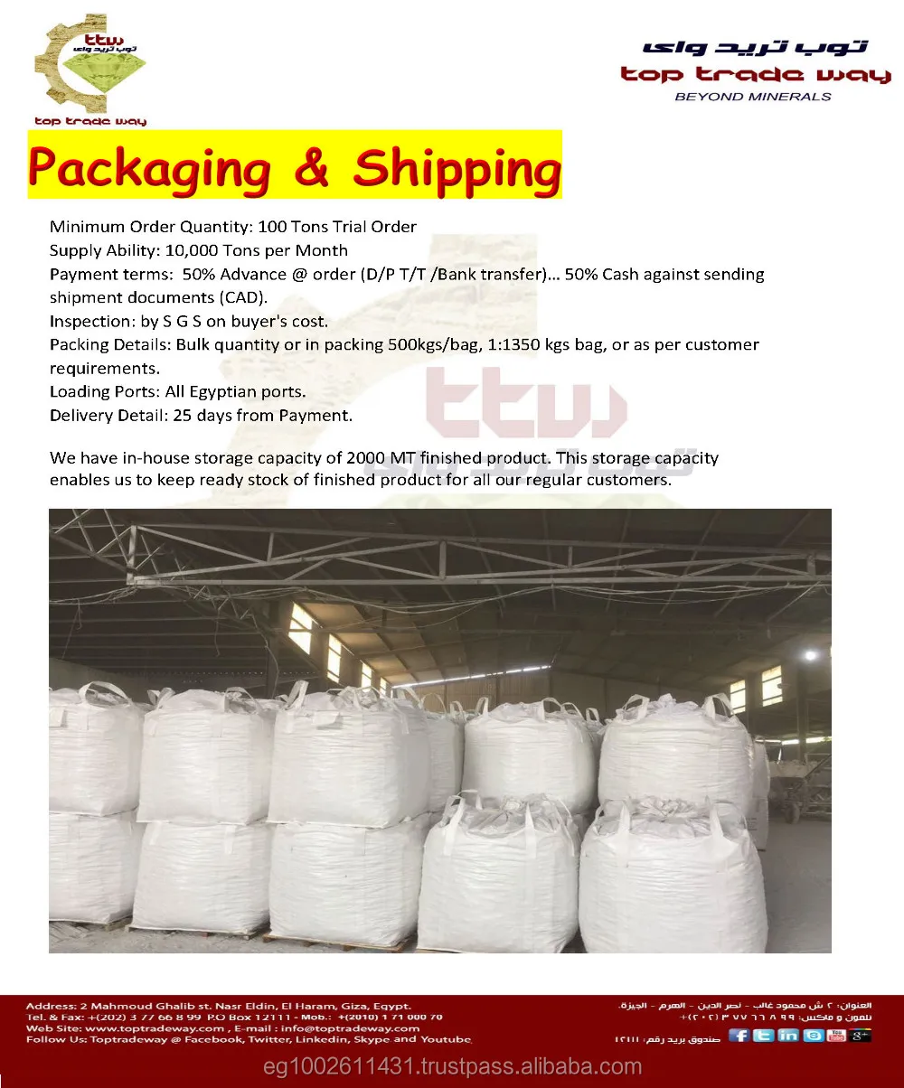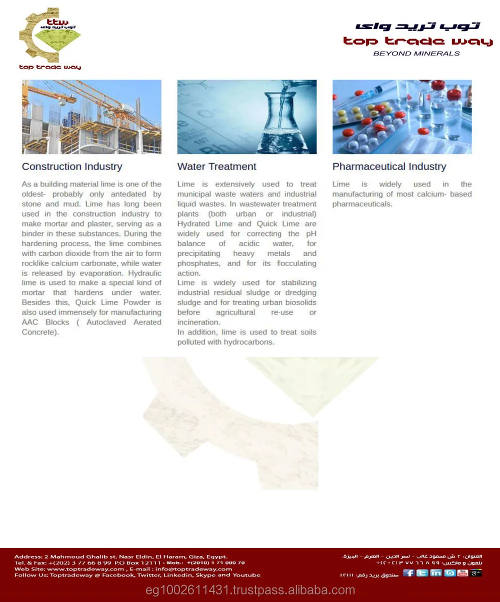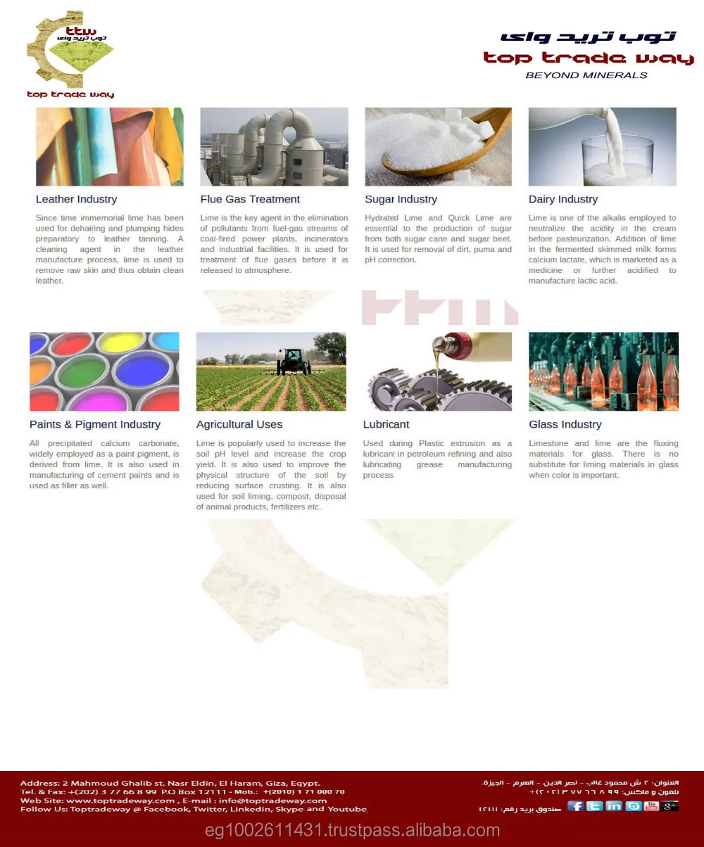 We're Mineral For Industry (MFI) and Top Trade Way (TTW) in Egypt, one of the largest and professional manufacturers of quick lime powder and lump lime (CaO), lime stone (CaCO3). With over 10 years experiences, we're now the main provider for most/large corporation in Egypt in the field of agriculture, environment, metallurgical industry, paper and pulp, chemical industry.
