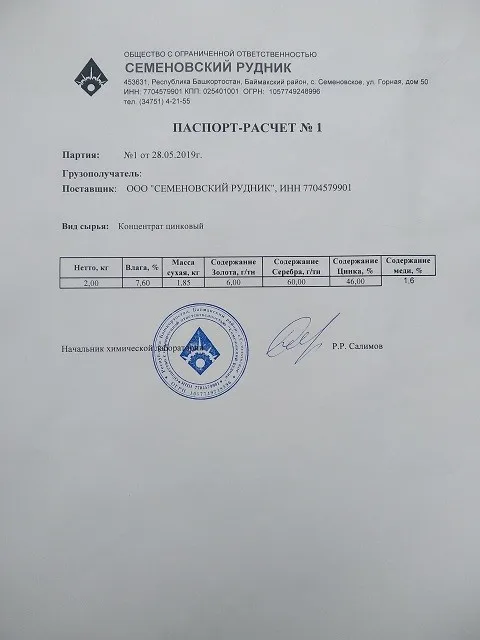 Zinc concentrate grade KC-4 with a full chemical analysis of 90% prepayment of the total cost of a monthly batch of zinc concentrate. Volume 1000t / month